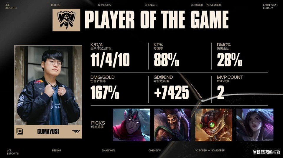 中期20分钟Hope的EZ突然E脸输出,被keria洛E控住,T1配合击杀AL下路双人组,虽然Tarzan琪亚娜R三人,换掉Oner潘森,AL拿下厄塔汗。27分钟双方争夺小龙,圣枪哥挖掘机绕后被Faker岩雀防守击杀,随后Faker岩雀大招封路,shanks瑞兹被秒,T1拿下火龙魂后追击团灭AL,又拿下第一条大龙。最终后期34分钟双方小龙坑混战,Gumayusi韦鲁斯疯狂输出击杀AL下路双人组,T1轻松打出0换5后,拿下第一局的胜利。首局伤害最高的是Gumayusi韦鲁斯。