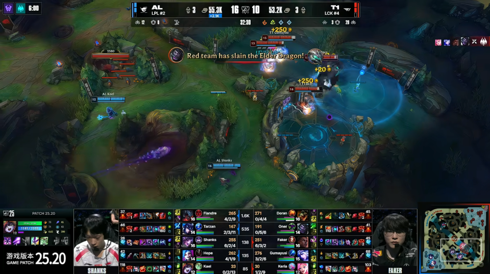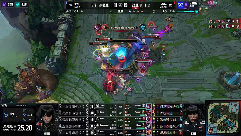 第五局AL上单剑魔,打野猪妹,中单辛德拉,下路金克丝加璐璐;T1上单鳄鱼,打野蒙多,中单梅尔,下路艾希加萨勒芬妮。3分钟Tarzan猪妹抓下,但是T1打出1换1,Keria萨勒芬妮拿到一血。前期AL推掉下路一血塔,T1则是拿到2条小龙和峡谷先锋,双方经济基本持平。
