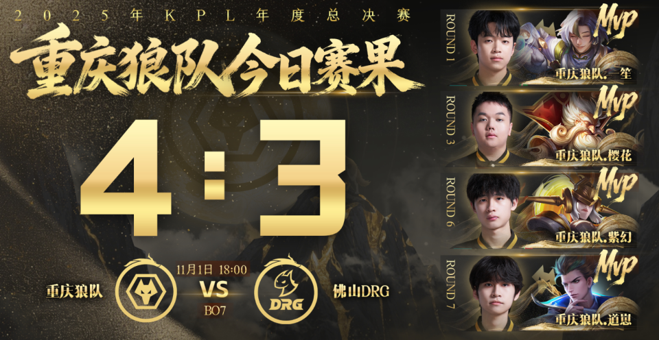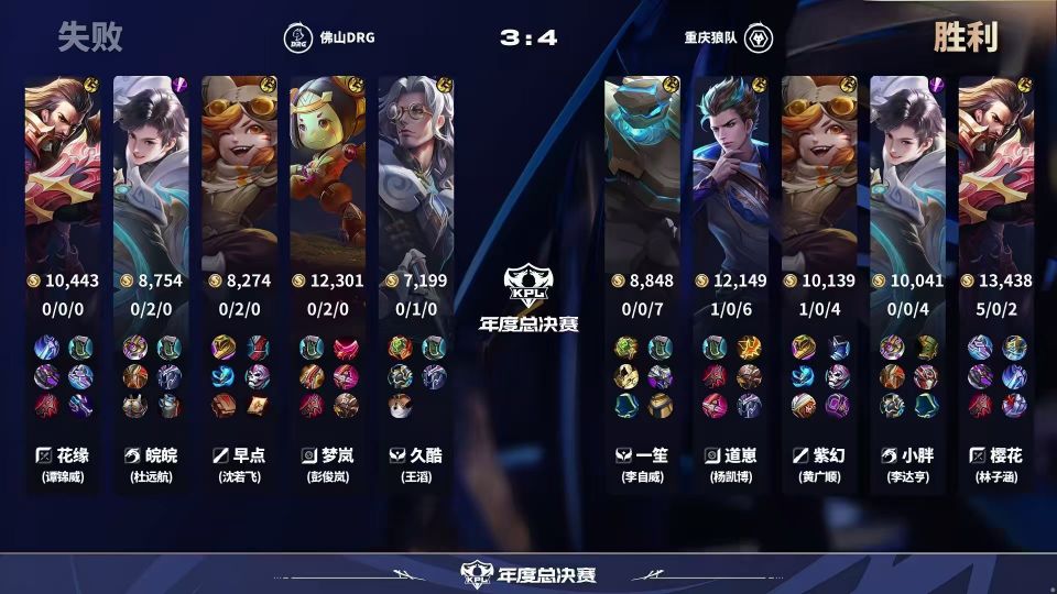 最后DRG只剩三人,狄仁杰又是大闪命中鲁班,盾曹进场击杀梦岚。狼队五人带着三路兵线直推水晶,4-3拿下比赛。