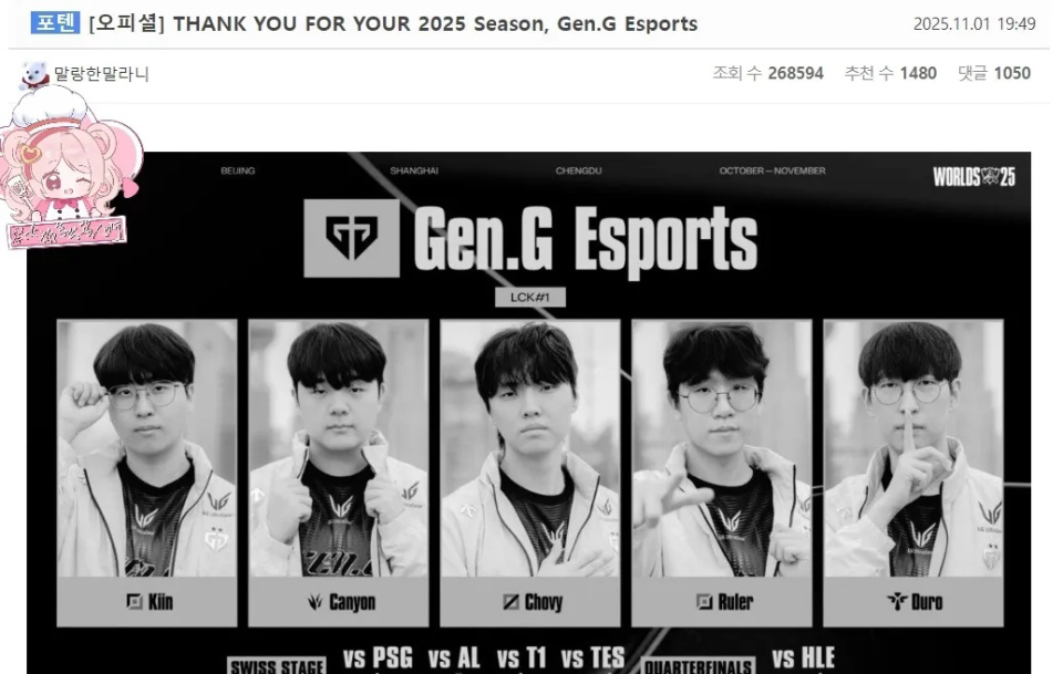 比赛结束之后,Gen战队的众人应该是被彻底打蒙了,他们的AD选手ruler拒绝了谢幕,径直离开,直接冲向了休息室,后面的队友都在面面相觑,是不是应该去前面鞠躬呢?大量的韩国网友也是彻底崩溃,毕竟chovy的世界赛成绩真的太差了8884844,甚至还有很多的玩家调侃珠峰是8848.43,而chovy却是8848.44。不出意外,韩网上流出了gen战队的黑白照片,这应该是韩国网友一贯的作风。说实话,如果kt战队或者lck赛区没能夺冠,估计kt战队应该也会被群嘲吧。