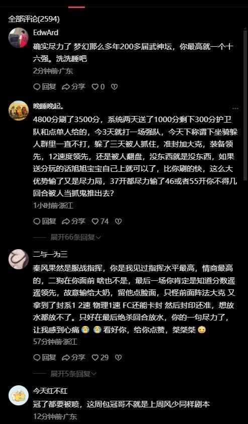 其次就是秦风还犯了巨大的错误,就是借着宝哥的平台起飞以后,然后有点目中无人了。老板之间可以互相嘲讽,你一个指挥嘲讽老板你真有点飘了,真的是宝哥太包容秦风了,二狗如果跟他一样优势局被翻盘他都自己退圈了,人家有立军令状的魄力,不赢就走人,但是人家秦风每次就一句我尽力了,就是仗着宝哥护着他,他是有恃无恐!