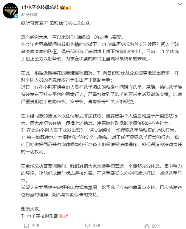 T1电子竞技俱乐部严正声明:向个别人员发出警告,请立刻停止一切侵犯选手隐私权的违法行为