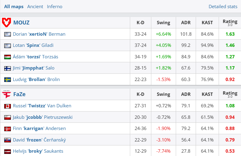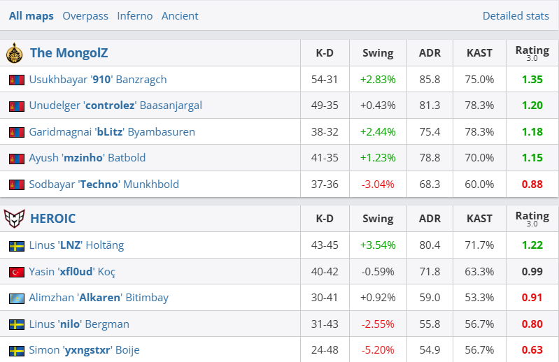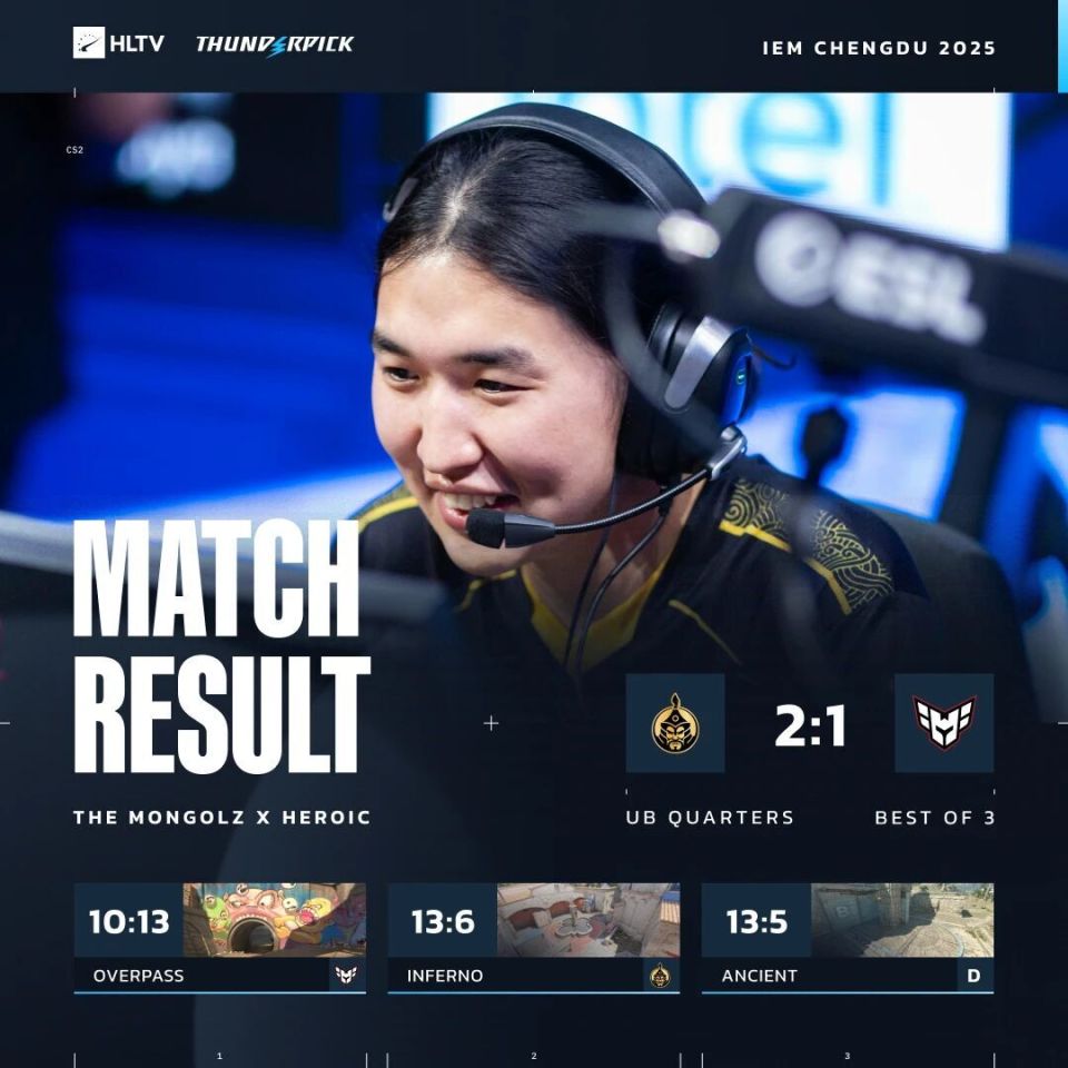 图一Overpass上HEROIC杀穿蒙古防线,半场进攻8-4领先,换边有惊无险赢下图一。图二Inferno蒙古救火队员——28岁老将“撤回哥”成为队伍发动机,单图砍下22-7的惊人数据,帮助MGLZ以铁血防守扳回一城。决胜图Ancient尽在蒙古队掌握之中,MGLZ在进攻方便9分在手,换边轻松终结比赛。