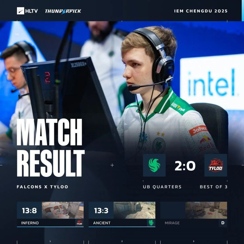图二Ancient小孩4杀赢下手枪局,猎鹰一上来便攻势如潮,TYLOO溃不成军0-8开局。Jee完成1V2后终于守下第1分,半场追至3-9。换边小孩再度手枪局4杀,猎鹰无懈可击轻松终结比赛。