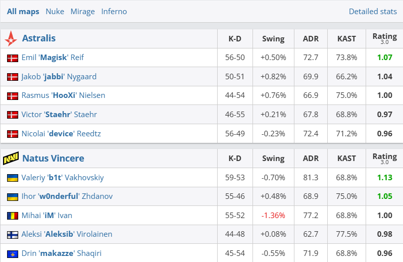 图一Nuke从开始双方就陷入拉锯战一路打进加时,Astralis最终凭借device在加时赛中的发挥先拿下图一。然而图二Mirage面对NAVI的钢铁防守,丹麦人束手无策败下阵来。决胜图Inferno,两队再次陷入加时大战,这次Astralis更加游刃有余,连下4局一口气终结比赛。