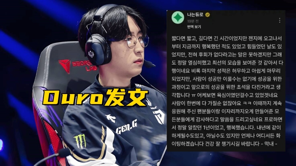 同时GEN的辅助选手Duro发文称:明年可能还在一起并肩作战,也可能不在,但无论在哪里,我都会一直加油,转会期说这种话,那大概率是要走了,说实话GEN输KT,辅助确实有点问题,但也不是把把都坑,而且相较常规赛,Duro是有明显的进步的,但GEN估计不想再花时间培养了。