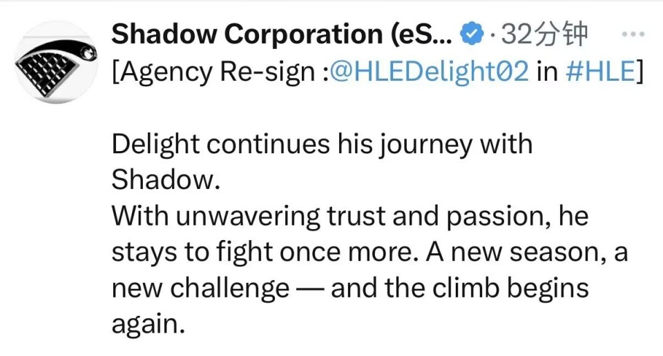 LOL世界赛还没结束,转会期抢人大战,就已经开始了,LCK赛区没有改革,转会操作,还是跟以前一样,HLE辅助选手Delight,近日闹出了一波乌龙,经纪公司Shadow发文官宣:HLE-Delight继续同行一年,大家都以为,HLE跟Delight续约了,结果是宣发失误,只是跟经纪公司续约。