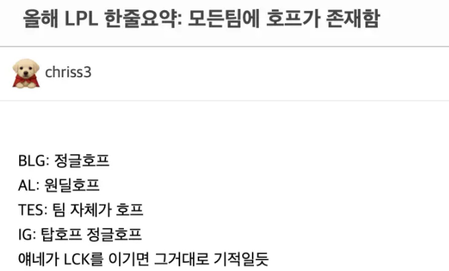 韩国网友点评S15的LPL,言辞犀利不留情面,TES最多人喷,韩网一句“每支LPL队伍都有Hope”,看似玩笑,实则是一针见血的讽刺,这一年,LPL在世界赛的整体表现的确让人难掩失望。