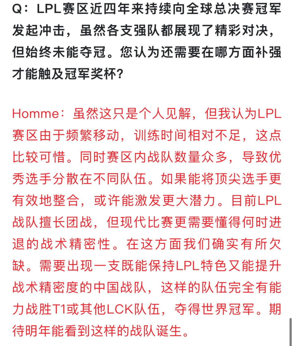 前言:S15赛季的比赛已经正式开始了,相信绝大多数的玩家都关注了最近一段时间的世界赛对抗,本以为lpl赛区这个赛季会崛起回归巅峰,没想到却成了最后一舞,整个的比赛状态波动的非常严重,两支lck赛区的队伍再一次决赛相遇。Tes战队的主教练红米在接受采访的时候公开表明了解决的办法,甚至还表示,只要按照他的这个想法去实行的话,lpl赛区绝对有能力去战胜T1战队或者是其他lck的队伍,在S16赛季拿到世界总决赛的冠军,事实上,他的想法应该和很多lpl的粉丝不谋而合。