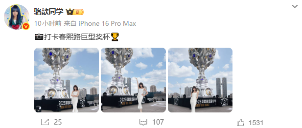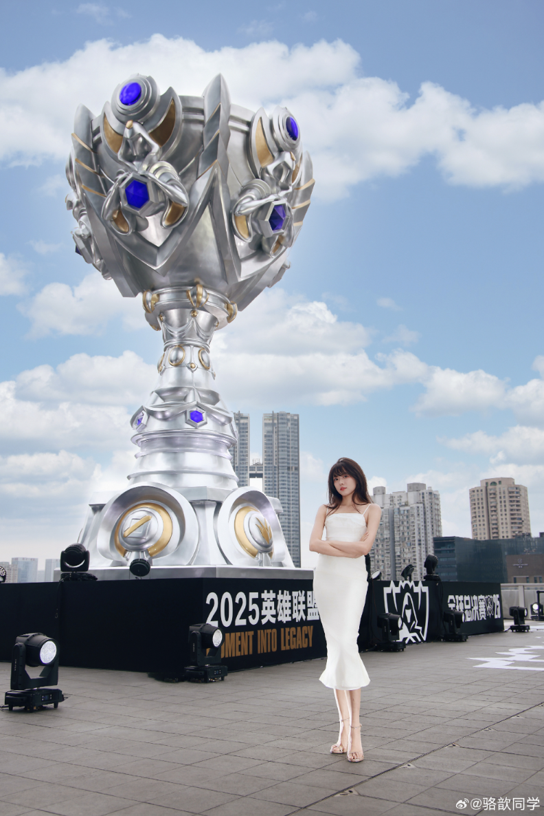 【LPL老婆】这身材比例绝了,骆歆身穿白色后妈裙和超大奖杯合影
