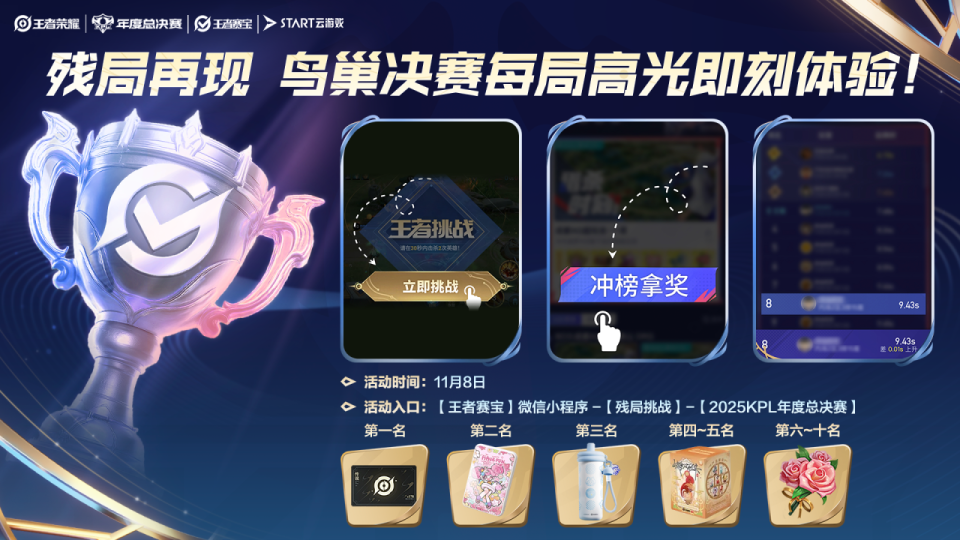 年度总决赛·决赛的每一小局结束后,玩家即可在活动页面立刻体验上一局出现过的高光时刻,亲自操作复刻决赛对局中的关键团战,完成指定残局还能参与冲榜,有机会带走【传说皮肤卡】、【王者周边充电宝】、【王者周边保温杯】等实物好礼哟~