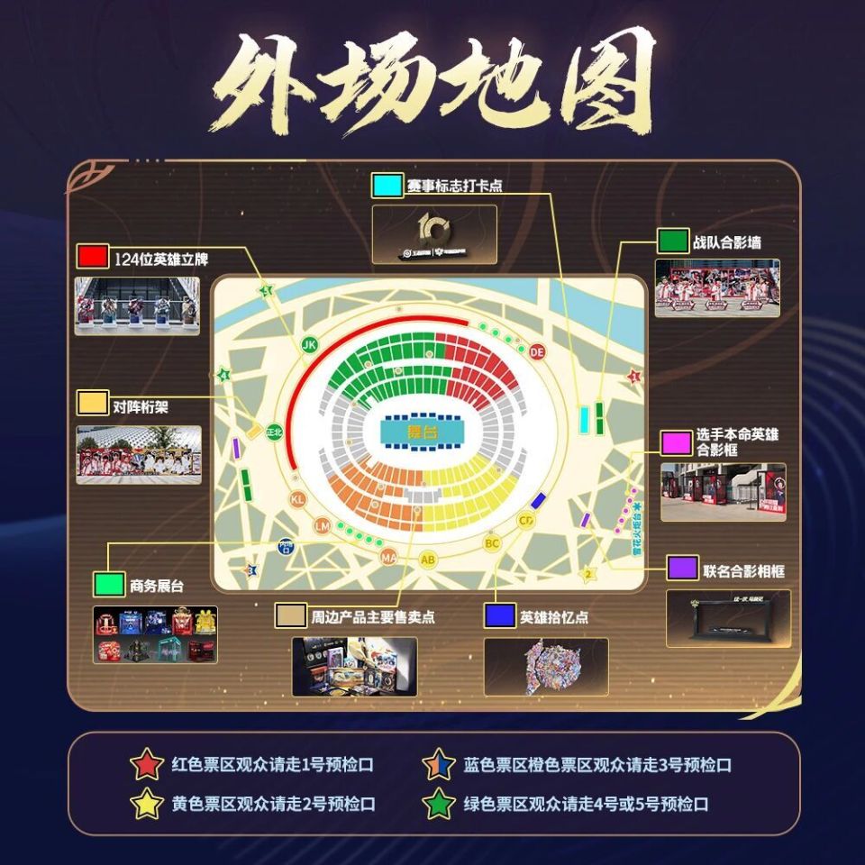 ✨检票口内·环廊:124位英雄立牌、战队合影框、选手本命英雄对抗框、十周年英雄群像、战队专属登梯
