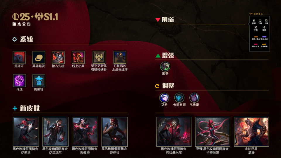 比如围绕诺克萨斯的设定,LOL增加了鲜血暴力风格的史实野怪(匹配诺克萨斯的印象标签)与“抢占先机”等全新机制(匹配战争的策略布局概念)。而它们也在改变游戏对局,如抢占先机替代了第一滴血和首个防御塔的金币奖励,加上击杀史实野怪构成该新机制,既引导了大家前期的战斗目标争夺,又解决了早期经济差的压制发育困局。