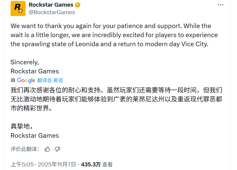 2025年11月7日,Rockstar Games X平台官方账号又发布了一条补充说明(上图):