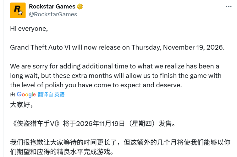 2025年11月6日,Rockstar Games X平台官方账号及官方网站上发布公告,宣布备受期待的开放世界大作《GTA VI》的发布日期将从原定2026年5月26日推迟至2026年11月19日星期四。