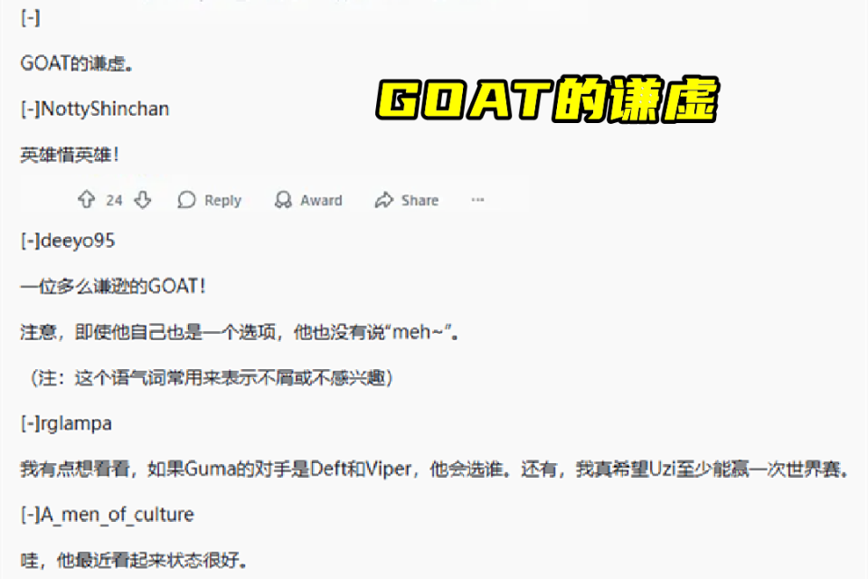 在Ruler出现之前,Uzi还有在更换选手,但Ruler出现之后,直接就稳锁了。甚至最后被问到自己和Ruler谁才是“史一AD”时,他也依旧选择了Ruler。这一行为在外网也是被大为夸赞,欧美玩家表示:Goat的谦虚,一位多么谦逊的GOAT!即使他自己也是一个选项,他也没有说“meh~”。只能说在欧美那边,Uzi的呼声还是很高的,他虽然没有S冠荣誉,但他的世界赛表现却得到了不少玩家的认可。