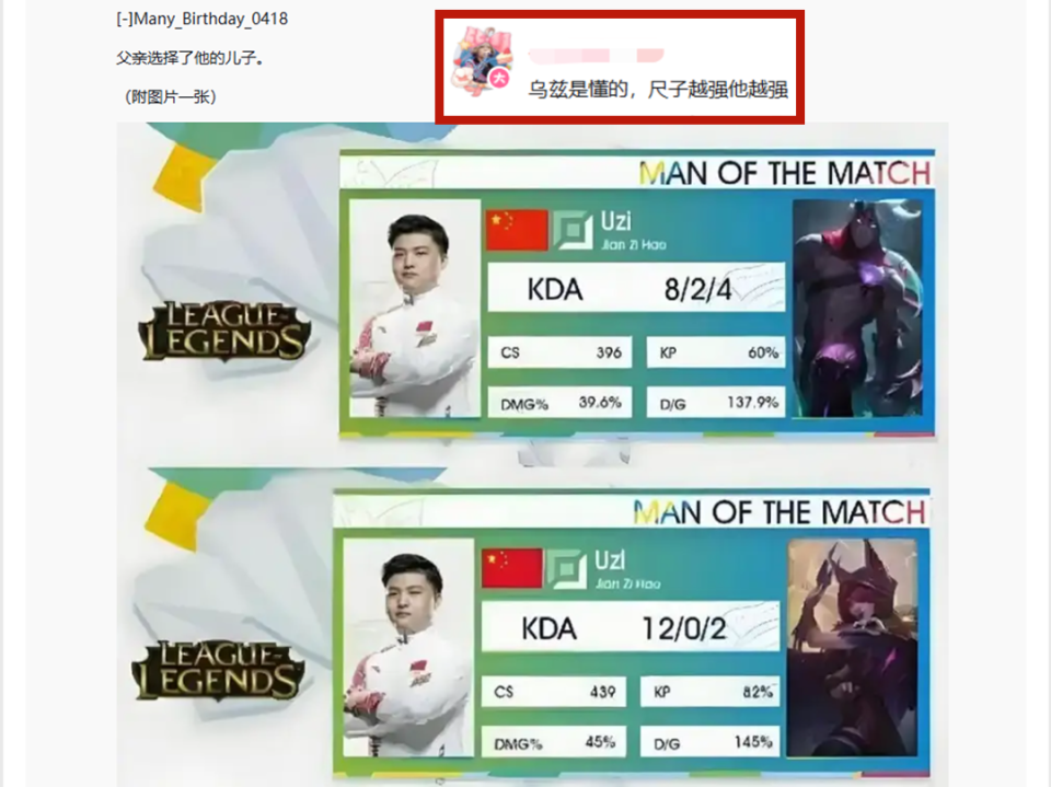 当然了,也有不少玩家是支持Uzi的,这不,有的直接放出了Uzi在亚运会上的战绩,并配文“父亲选择了他的儿子”。说白了,在Uzi打比赛那会,尺帝还真就有点“恐狗”,玩个AD对上Uzi都出上了布甲鞋。但在Uzi退役之后,转会LPL的他却难逢对手,如今更是多项荣誉加身。纵观他一整个职业生涯,也确实是一位传奇AD了,Uzi会选他也在情理之中。但论整活,那还得是咱们LPL。