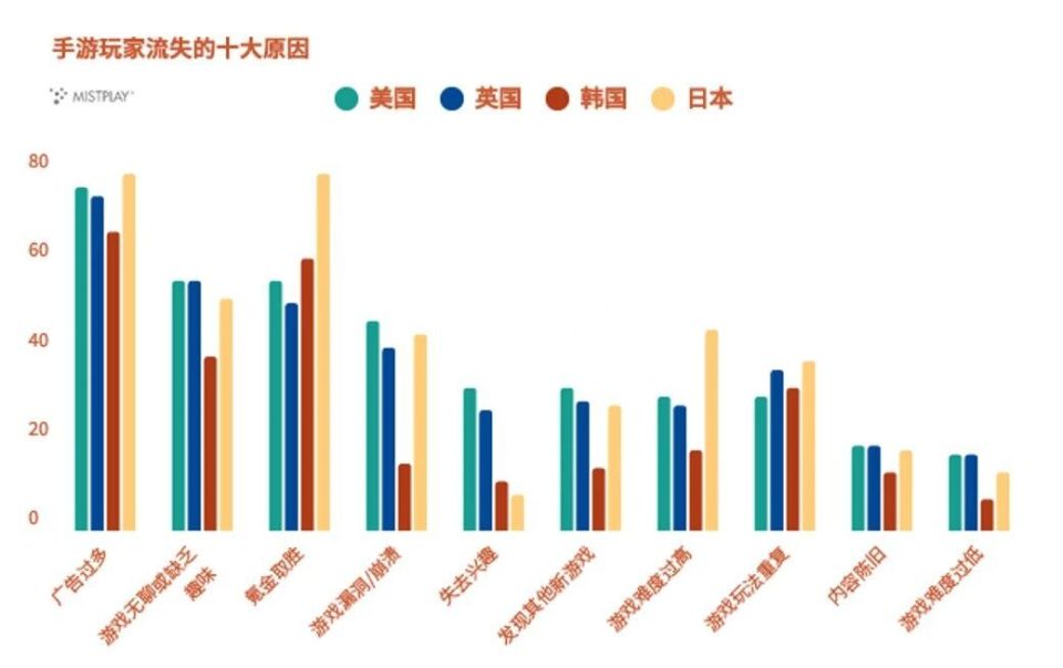 至于玩家流失的原因,无论是西方玩家还是东方玩家,最敏感的都是激进的变现方式——⽆论是⼴告数量过多,还是P2W机制都是导致玩家在前30天内流失的主要原因之⼀,其中⽇本玩家对此最为敏感(约81%)。除此之外,西方玩家对于游戏可玩性的要求更高,有56%的玩家可能因为游戏无聊而直接退坑。