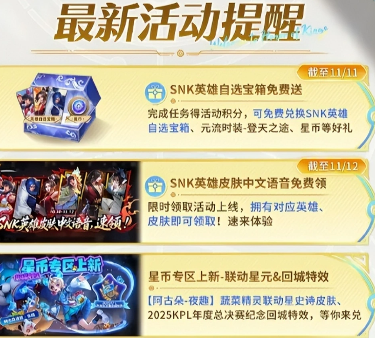最后再分享一波王者的福利,为了配合年总决赛的到来,这波福利也是直接拉满了,特别是喜欢SNK英雄的玩家,不容错过。比如SNK英雄自选宝箱免费送,登录游戏获得活动积分,就可以了,任务很简单,还有元流时装、星币等好礼。还有SNK中文语音免费领,蔬菜精灵联动星史诗皮肤,总决赛纪念回城特效,明星选手的趣味语音等,另外,决赛当天,还有冠军纪念头像框,只要和本命英雄一起完成鸟巢合影即可。快去感受吧。