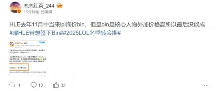 选手去留、教练更迭、薪资谈判,每一个消息都足以引发无数讨论,而在这一片热闹的转会传闻中,“Bin”的名字再度被推上风口浪尖,据爆料,早在去年11月,LCK的HLE就曾向LPL方面打听过Bin的转会价格,然而最终谈判无果——原因很简单,Bin的身价太高。
