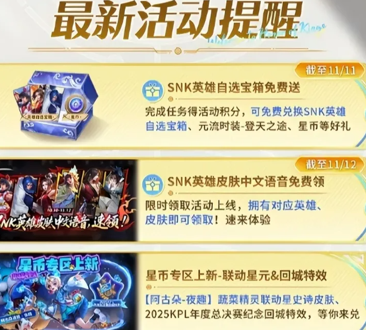 最后再分享一波王者的福利,为了配合年总决赛的到来,这波福利也是直接拉满了,特别是喜欢SNK英雄的玩家,不容错过。比如SNK英雄自选宝箱免费送,登录游戏获得活动积分,就可以了,任务很简单,还有元流时装、星币等好礼。还有SNK中文语音免费领,蔬菜精灵联动星史诗皮肤,总决赛纪念回城特效,明星选手的趣味语音等,另外,决赛当天,还有冠军纪念头像框,只要和本命英雄一起完成鸟巢合影即可。快去感受吧。