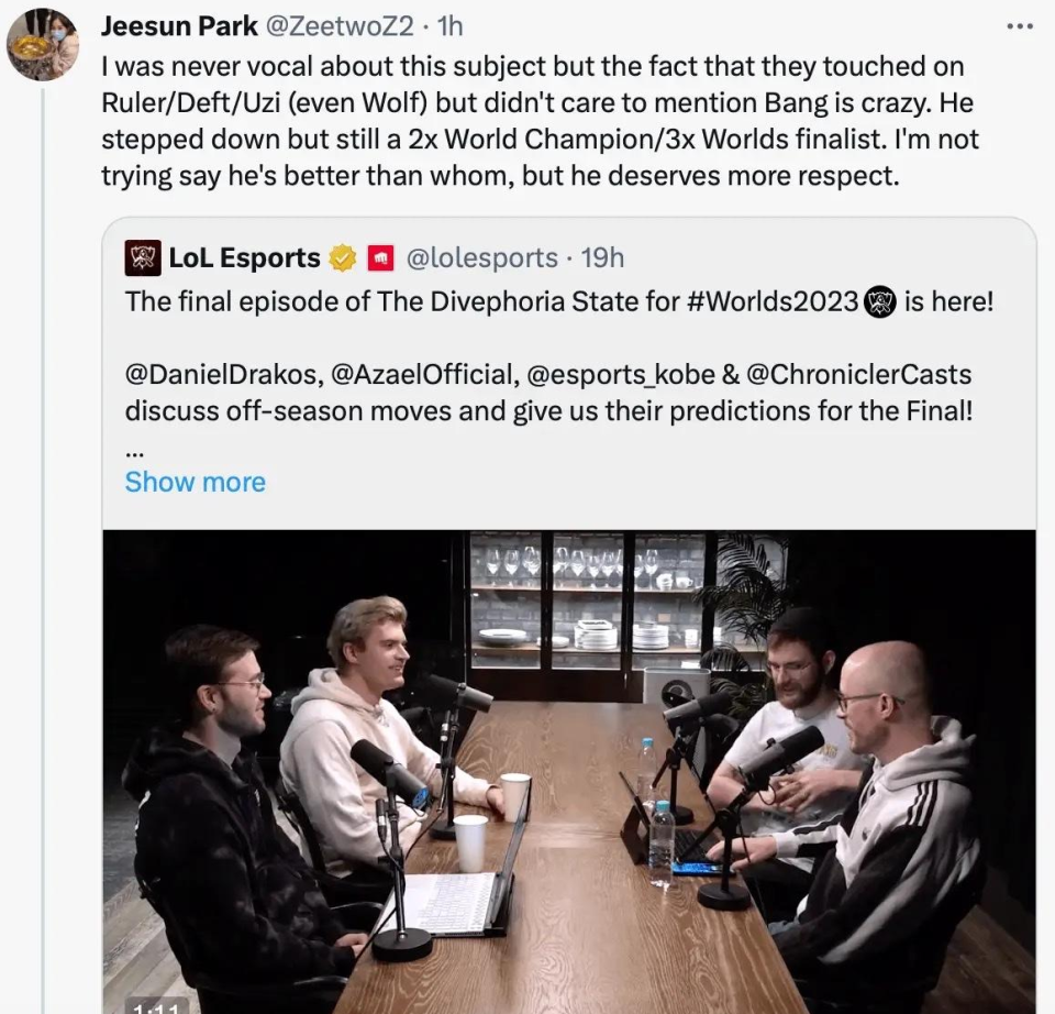 近日Uzi接受采访,选历史第一AD,最终没有选自己,选择了曾在LPL的JDG效力,现GEN战队的Ruler!最后问Ruler还是Uzi,Uzi还是选择了Ruler,Ruler是Uzi心目中的历史第一ADC!志宣发文:选项里没有一些世界冠军,真的让我很难过。虽然志宣在评论里解释:我没有偏老公啦。但网友也知道,志宣指的选项里没有的人,正是在SKT拿过2届世界赛冠军和2届MSI冠军的Bang,也是志宣的老公。这不是志宣第一次为Bang发声了,23年LOL Esports官方的一个节目,几位解说和主持人讨论历史第一AD,没有提到Bang。志宣就转发说:“他们提到了Ruler,Deft,Uzi,甚至提到了Wolf,但是却一句不提Bang,这太疯狂了。他确实退役了,但依旧是2届世界赛冠军,3次打进世界赛决赛。我并不是想说他比其他人更强,但他值得更多尊重。”所以真不能怪Uzi不选Bang,是主持人根本就没问Bang。中韩观众讨论史一AD时,总会想到Bang,为什么西方观众不会呢?主要是因为当年北美的100T花高价买了Bang,原本能进世界赛的100T却被Bang坑成联赛倒数第一。Bang就被扔2队去了,打次级联赛也打不过。最后100T还降级了。西方观众就觉得Bang是来北美捞钱的,自然对其评价不高。举个不恰当的例子,Zeus加入JDG,把JDG带成倒数第一,你还会认为Zeus是史一上吗?即使主持人问了Bang,可能Bang vs 其他选手比如Rekkles,Uzi会选Bang。但Bang vs Ruler,可能Uzi还是会选Ruler!很多人调侃因为Bang是神父,Ruler是神子,Ruler地位越高,Uzi地位才越高。但真正原因是,“历史第一XX”这个称号显然是要考虑整个职业生涯的表现。Bang在S5-S7确实很强,拿了很多冠军,但他的队友可是巅峰Faker。NBA球星奥尼尔曾说:“我奶奶跟乔丹都能夺冠。”Bang跟着巅峰Faker夺冠,离开SKT就迅速成路边,这点对他很不利。而尺帝从S7出道,一直到现在S15,每年都是一线选手,在中韩两个赛区不同队伍都有优异表现,拿过亚运会金牌,MSI冠军和世界赛冠军,世界赛唯一ADC位置FMVP,和Faker一样都是极度自律,职业选手的标杆。所以尺帝才得到了Uzi的认可。Bang应该在历史第一AD的讨论范围,但真正能当选的还是Ruler,而且Ruler以后一定会进拳头名人堂!