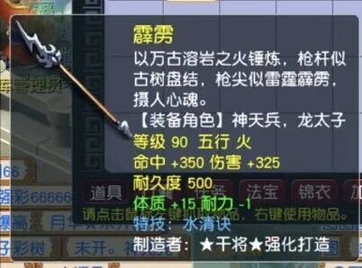 90级的枪,伤害+325,命中+350,体质+15,耐力-1,特技是水清诀。
