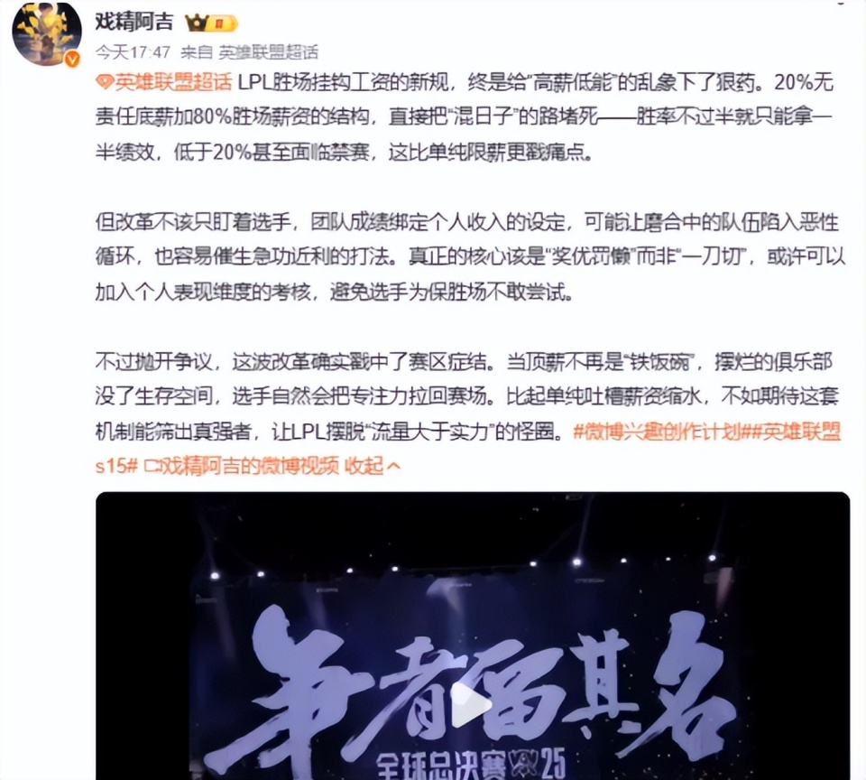 这名知情人就透露,LPL选手薪资变化是20%的无责底薪,加上80%的胜场薪资构成。这就直接把混日子的选手路给堵死了,胜率不过半的选手估计只能拿到一半绩效。这样改革的核心不是一刀切,而是要分清奖优罚懒。在这其中可以加入个人表现维度考核,哪怕输了比赛选手,个人表现优秀,依然可以拿到不错的薪资。