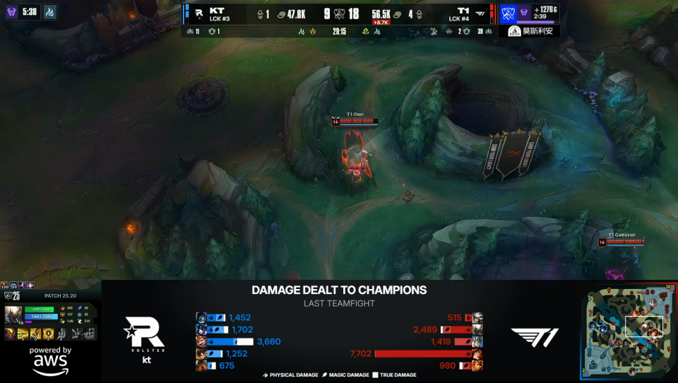 中期双方争夺峡谷先锋,Doran安蓓萨直接开到Deokdam艾希,T1打出0换2后拉扯打厄塔汗,KT其他人想要阻止被T1团灭,T1拿下厄塔汗。28分钟双方中路混战,虽然Oner赵信开团率先被秒,但是BDD瑞兹被keria波比锤走,T1打出1换3后,拿下第一条大龙。后期35分钟T1拿下第二条大龙,之后Doran安蓓萨直接开团,Deokdam艾希再次被秒,T1打出0换4后,拿下第二局胜利。首局伤害最高的是Gumayusi韦鲁斯。