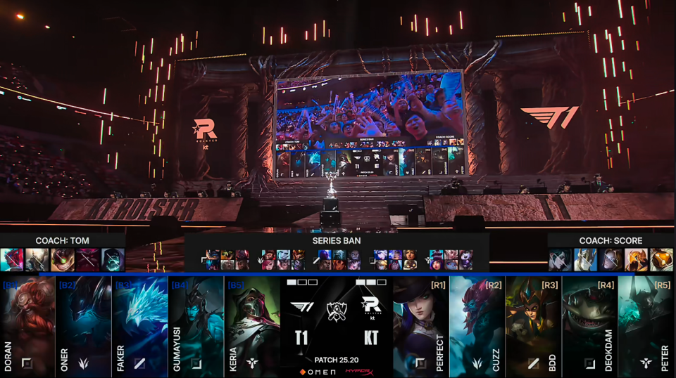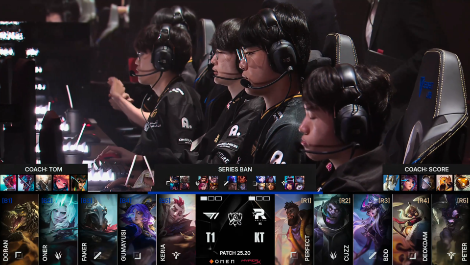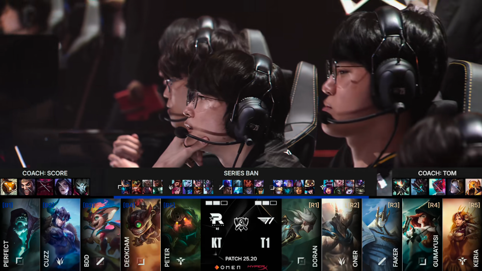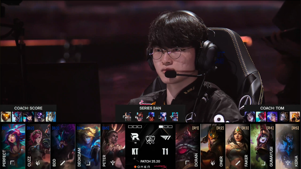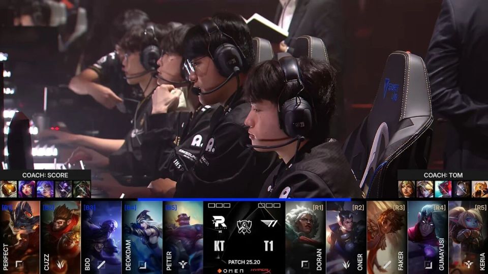第一局比赛,KT蓝色方,禁用:巴德、妮蔻、芸阿娜、牛头、烈娜塔,选用:PerfecT兰博、Cuzz猴子、Bdd瑞兹、deokdam艾希、Peter布隆;T1红色方,禁用:希维尔、伊泽瑞尔、永恩、发条、沙皇,选用:Doran安蓓萨、Oner赵信、Faker岩雀、Gumayusi韦鲁斯、Keria波比