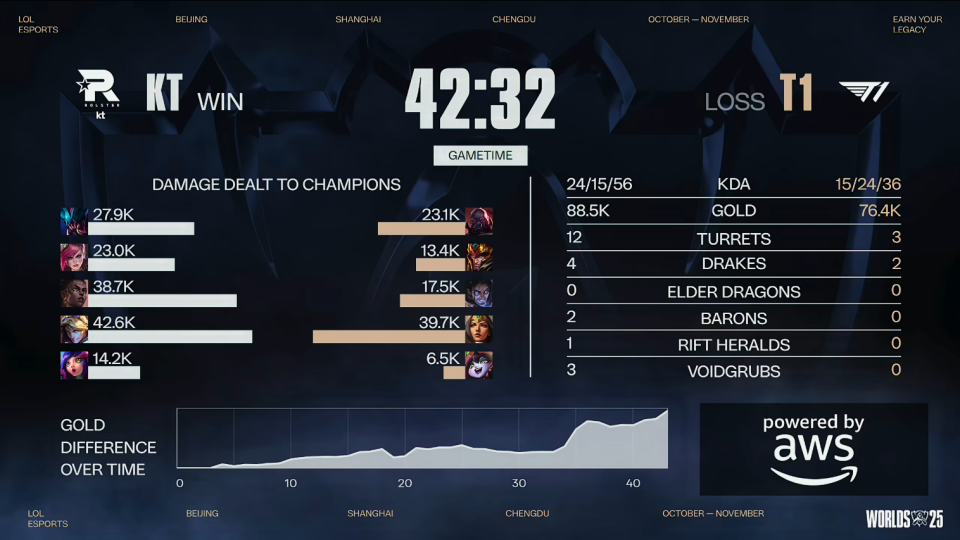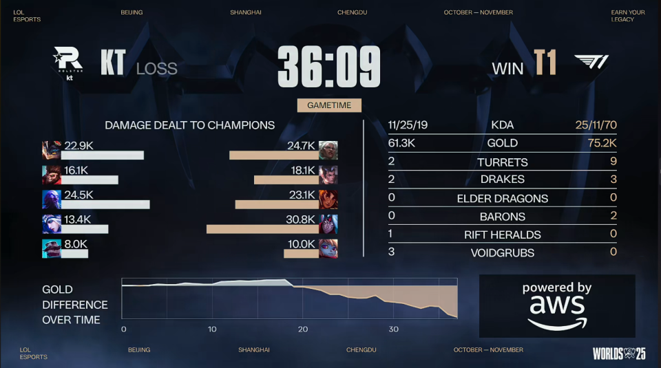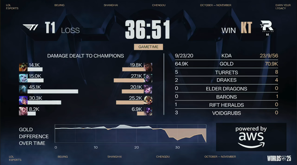 结果第一局比赛,两队各打了半场好局,T1笑到了最后。比赛前期,KT一度在上下路打开局面打出2k经济领先;比赛第18分钟左右,两队爆发小龙团。T1一波打出0换4大胜后反超经济;比赛第22分钟左右,两队爆发厄塔汗团。Doran进场帮助队伍打出0换2,后续T1一波再打出2换4后拿下厄塔汗;比赛第25分钟左右,两队爆发小龙团。T1一波打出1换3大胜拿到小龙;比赛第27分钟左右,KT集火掉Oner赵信后被T1包围,T1追击打出1换3后拿下大龙;最终比赛第36分09秒,Doran安蓓萨先手开到deokdam艾希,T1拿下大龙后打出0换3一波结束比赛。