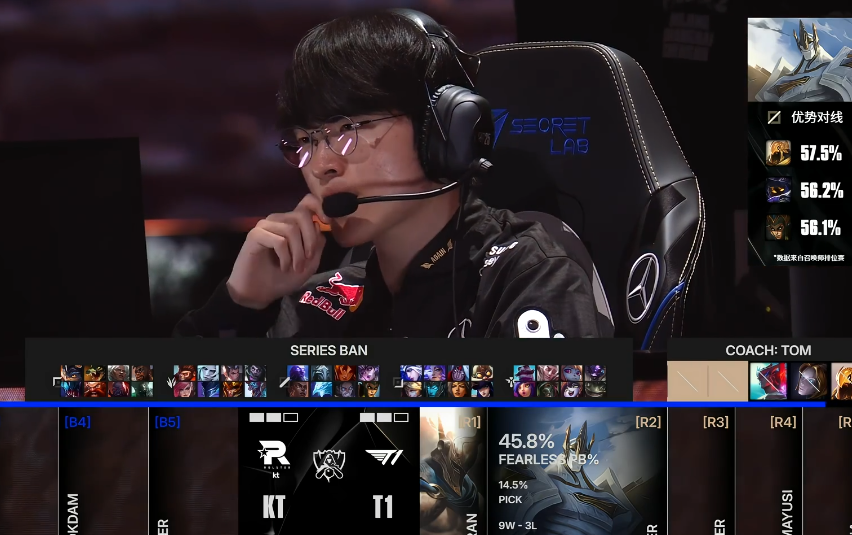 回顾这轮对决,从第一把就肾上腺素拉满,毕竟一上来T1就展现出了强大的韧性,第一把就翻盘成功,辅助波比的神来一笔,直接让KT的猴子原地罚站,反应太快了,T1完成翻盘。之后KT也是还以颜色,用T1的方式击败T1,一把梅尔、一把蒙多打野,直接率先拿到赛点。