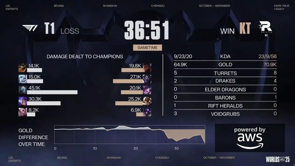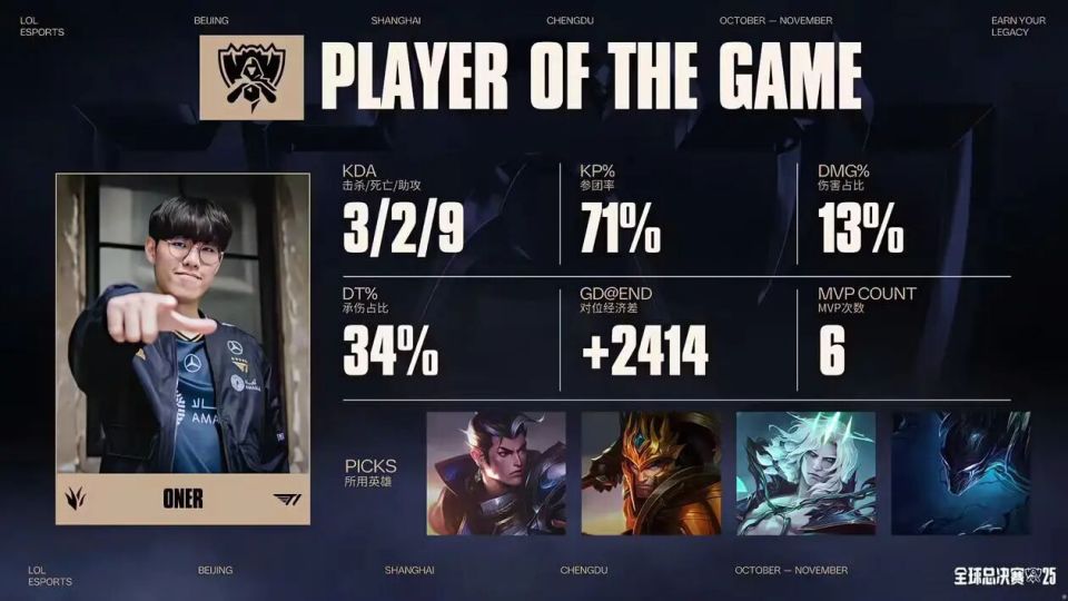 转折发生在下路的厄可汗团,得益于ad女枪的出色发挥,T1一波打出了超6k的经济差,并始终压制住了对手,最终拿下比赛,捧起冠军奖杯。