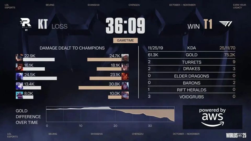 决胜局战况异常焦灼,前期kt人头数领先,经济更好;而T1则拿到了大量中立资源,手握多条小龙。这种微妙的平衡,被T1在小龙的一场完美团战给打破了。至此,kt再也无法阻挡他们的攻势,T1成功扳回一分,将比赛拖入最后的决胜局。