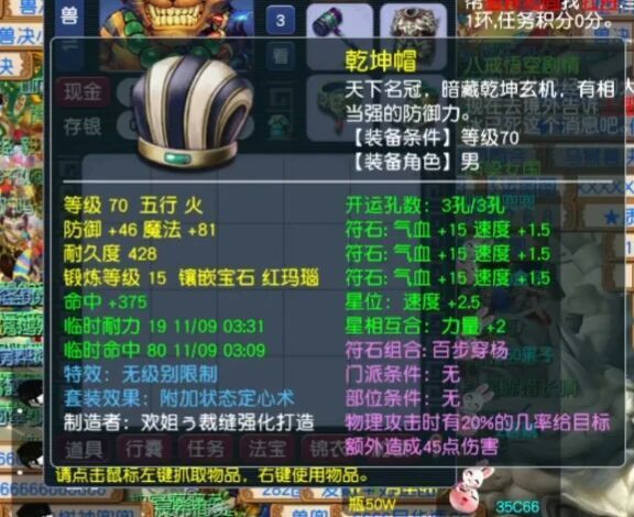最后一个就是宝哥被称之为“刀把哥”这个称号由来的装备,70级的无级别男头,防御+46,魔法+81,然后打了15段的红玛瑙,而且还花了五六千一个收了四个附魔宝珠还没点化出变身套,大家觉得宝哥的这一身的装备如何?这套装备比很多的辅助门派的速度都要快,绝对是齐天大圣最快速度的狮驼岭!