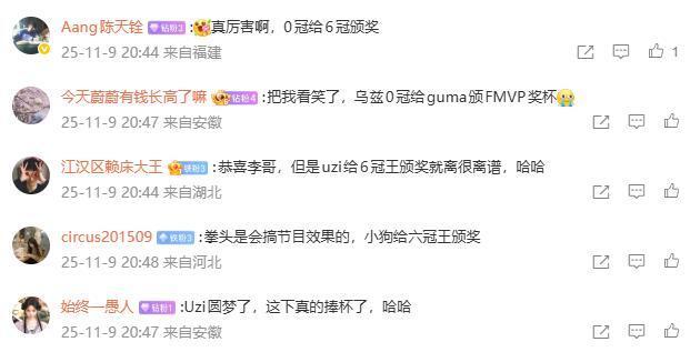 当然了,就在T1夺冠之后,在颁奖环节,出现了离谱一幕。想必观众们都有看到吧,来自LPL赛区的传奇AD选手Uzi简自豪,出现在了颁奖台上面。没错,今年是在国内举办的世界赛,所以作为东道主,选择了Uzi给FMVP选手进行颁奖。而最终,Uzi将FMVP奖杯颁给了gumayusi,同样作为ADC位置,Uzi将FMVP奖杯给到姑妈,还是很符合的。但是呢,有不少观众都在吐槽,为什么是0冠王给6冠王颁奖呢?