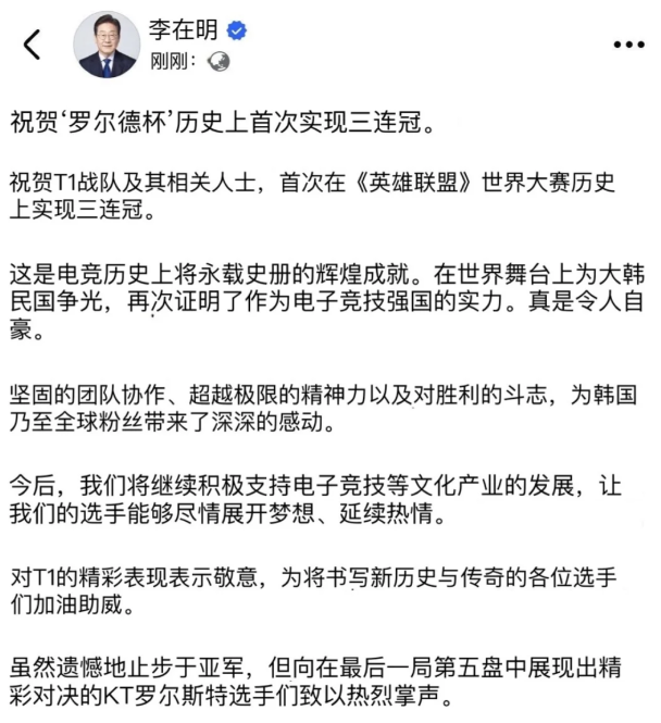 韩国总统发文祝贺T1 3连冠:在世界舞台上为大韩民国争光
