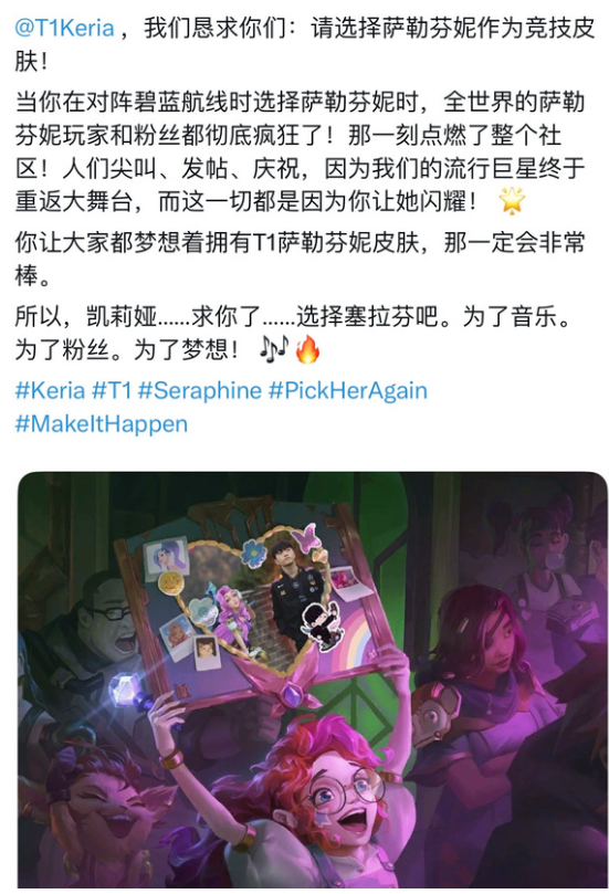 规则是世界赛上玩过的英雄才能选,先看一下可选清单。Doran在个人INS上发布投票:皮肤选择安蓓萨,酒桶,卡蜜尔,其他?网友都调侃,如果Doran选青钢影,在青钢影皮肤上签下自己的名字,“饼哥”看到要气坏了。但我觉得Doran大概率是选狼母安蓓萨来作为他的皮肤,因为不管是联赛还是世界赛,狼母都是Doran最Carry的英雄。决赛第一局,其实翻盘关键也是Doran狼母的开团。今年一整年的职业赛事,狼母在上单位置也是非常热门的英雄。Oner在韩文流赛后采访时,调侃说:“想要蒙多皮肤的粉丝相当多呢,我会考虑一下蒙多的。”Oner真有可能选蒙多皮肤,别人的皮肤都是最擅长的英雄,Oner直接选只玩过一次的英雄,会更加特别。而且蒙多最大的特点就是肉,和Oner喜欢健身也有相似之处,回城动作可以是Oner的读技能或单手举奖杯,都非常有梗。Faker在接受余霜采访时,透露冠军皮肤选谁还没定,要看粉丝投票。很多人都觉得Faker该给加里奥一个皮肤了吧,每次关键局,加里奥总能帮Faker获胜。但看粉丝投票,变数就太多了,去年谁也没想到,永恩会在冠军皮肤的投票中胜出。今年是不是加里奥,还是得看投票。不过Faker明年还会继续打,万一明年又夺冠了呢?Gumayusi还没有透露冠军皮肤的消息,Gumayusi比较好的地方是,他作为FMVP,可以选2个皮肤。Gumayusi已经有的冠军皮肤是金克丝和韦鲁斯,猜测他可能会选芸阿娜和女枪,一个是世界赛期间非常强的AD英雄,一个是决赛第五局帮他拿FMVP的英雄。在下方评论区,都是萨勒芬妮的粉丝和妮蔻的粉丝在争。所以璐璐应该是出局了,Keria的皮肤会是萨勒芬妮或者妮蔻。总结一下,T1的冠军皮肤可能是上单狼母,打野蒙多,中单看投票,下路未知,辅助萨勒芬妮或妮蔻。