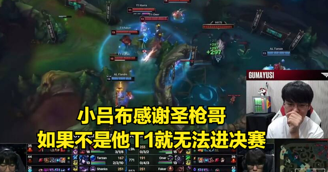 小吕布在直播当然把AL输掉比赛的“锅”甩给AL上单圣枪哥,小吕布认为圣枪哥第一局挖掘机和生死局剑魔都给在关键团出现失误,导致被T1抓住机会集火击杀,尤其是剑魔在生死局一个人排眼的操作,更是被小吕布坦言,如果没有圣枪哥这波“送人头”,T1这局比赛应该就会输了。(当然也有不少LPL观众认为,圣枪哥只是太想赢所以才会出现失误,如果跟AL下路AD一样站在后面不敢输出,那么圣枪哥就不会轻易白给)