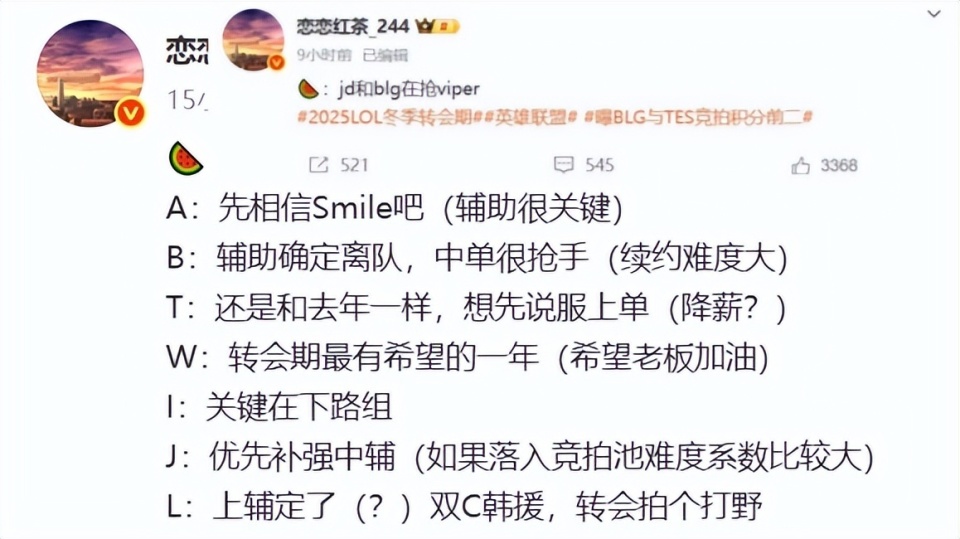 LPL最强野辅成功续约!BLG辅助ON离队,管理层和京东争抢Viper