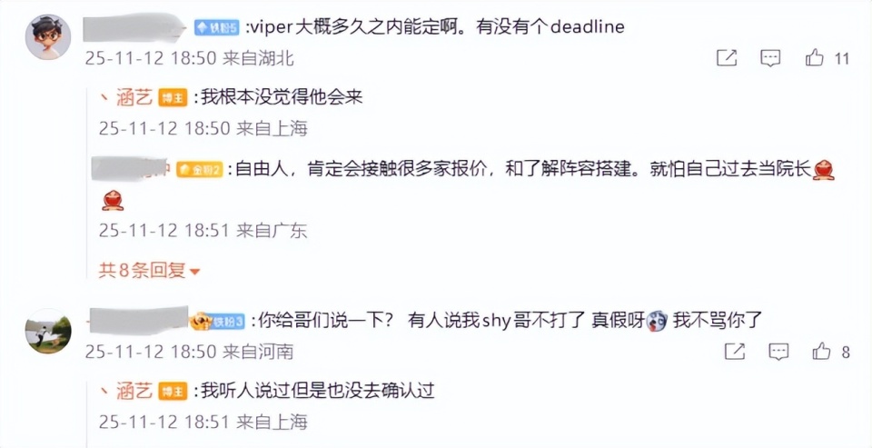 最后就是涵艺在评论区回应网友,他先是表示自己不觉得Viper会来LPL,接着透露自己也听说了theshy不打的消息,但是还没有确认。