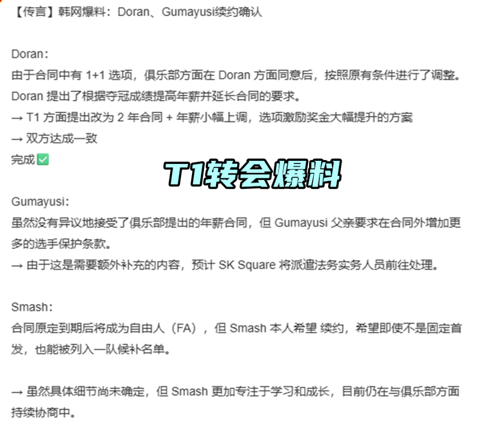 Oner、Guma、Keria虽满足“长期效力选手”,但并不是优秀选手,仍需要继续拿LCK联赛冠军来获取荣誉积分。所以就T1目前的情况来看,想给到全员顶薪,势必要承担一笔沉重的税收,续约也就出现了问题。不过韩网又爆出了一条消息,Doran和Guma的续约确认了,Doran起初提的是根据夺冠成绩提高年薪和延长合同,被T1改成了2年合同+年薪小幅提升,激励奖金大幅提升,已达成共识。