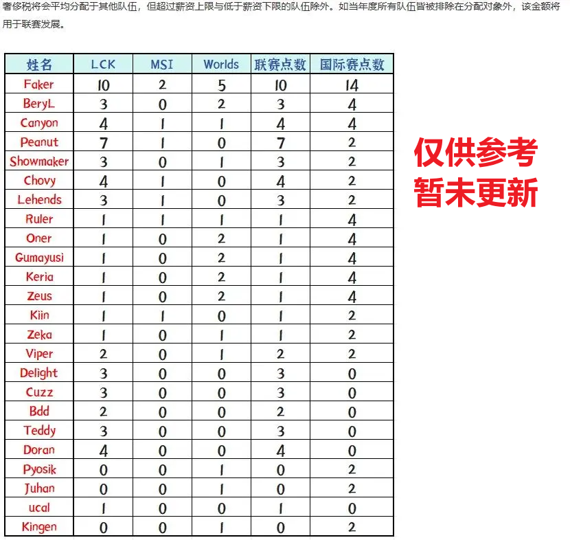 只要达成了“长期效力选手”、“优秀选手”这两个条件之一,选手的薪资就能打折。长期效力选手的条件是:在同一支战队连续服役超过3年,该选手薪资的70%计入薪资帽;优秀选手的条件是:满足特定荣誉积分的选手,薪资的50%计入薪资帽;若有选手同时达成上述两个条件,即可享受双重折扣:薪资的35%计入薪资帽。而满足上述两个折扣的,T1这边就只有Faker一位选手。