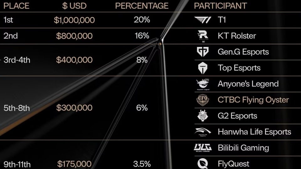 拳头官方在近日,正式公布了2025年,LOL全球总决赛,参赛战队奖金分配情况,拿到冠军的T1战队,独享100万美刀(后面都是刀),亚军KT是80万,四强的滔搏和GEN,各自拿到了40万,而止步八强的G2、AL、HLE、CFO是30万,第9-11名的BLG、FLY、MKOI,三队都是17.5万。