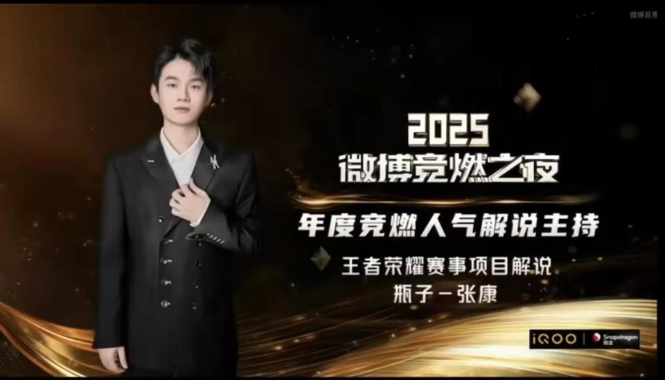 现代快报讯(记者 刘媛)11月13日晚,2025年微博竞燃之夜活动在北京国家游泳中心(水立方)举行。王者荣耀解说“瓶子”张康荣获“年度竞燃人气解说主持”。