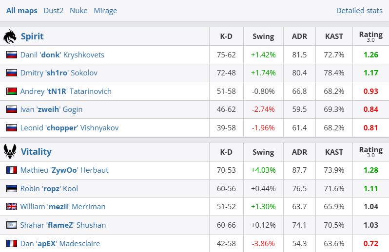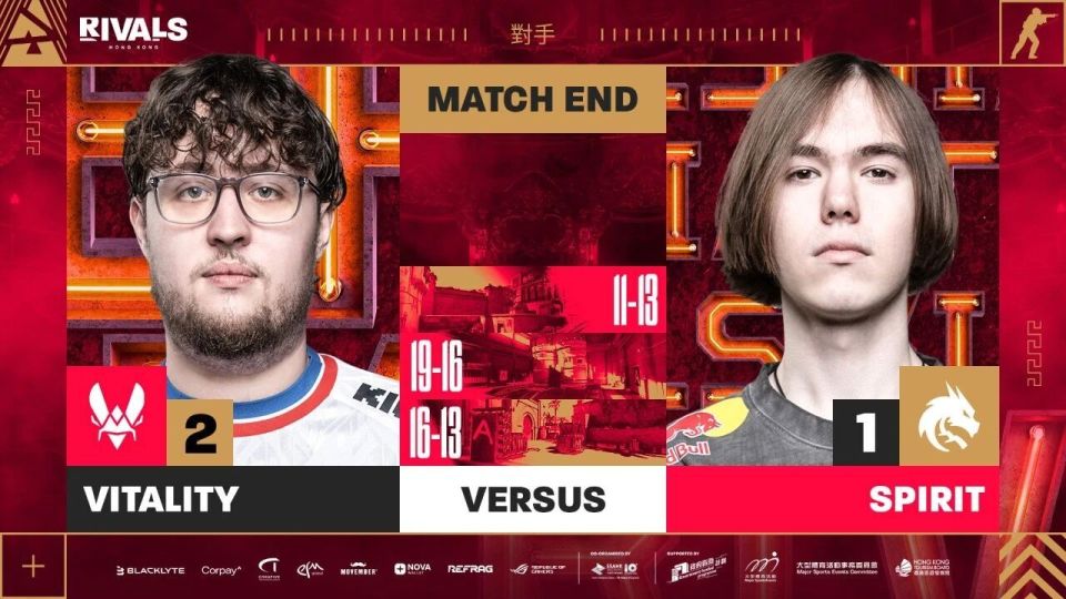 决胜图Mirage两队开局来回翻盘,但apEX和ropz在B二楼摆阵翻盘,大黄蜂乘势守出一波6-1。长枪局起donk在A区双杀,chopper在B点单局3杀赢下3V5残局,zweih剩10秒截警家送sh1ro去B四秒下包成功,绿龙半场追至5-7。换边Spirit四B赢下手枪局追至7平,长枪局chopper单顶B二楼痛失好局,Vitality再度10-7领先。劣势下donk中路死战不退四处刷屏,又追至10平。关键局zweih跳台面对俩背身仅杀1人,sh1ro更是空枪送对手11分。虽然大黄蜂随后融化A区取得赛点,但第24局在3V4劣势下zweih单A三杀翻盘追进加时。加时赛薯薯、mezii轮番站出来进攻全取3分,终结比赛。