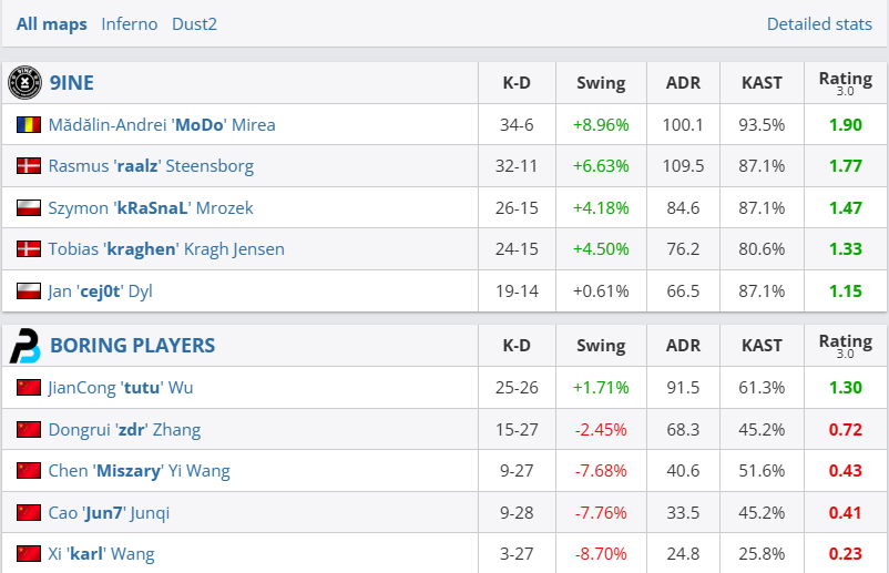 图一Inferno,kRaSnaL三杀赢得手枪局,随后raalz、kraghen和MoDo火力全开,波兰队全员状态在线半场豪取11分。换边9INE再下手枪局,轻松先下一城。
