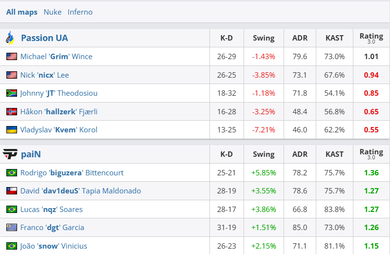 图二Inferno,小雪3杀赢下手枪局随即被翻,Grim与nixc完成2V3,PUA开局4-1。长枪局起dgt火力全开,巴西队半场7-5反超。换边paiN再拿手枪局将优势扩大至10-5,长枪局nicx在二楼扫转双杀终于拿到防守第1分。但巴西队的攻势不减,终局nqz大狙一箭双雕单局3杀终结比赛。