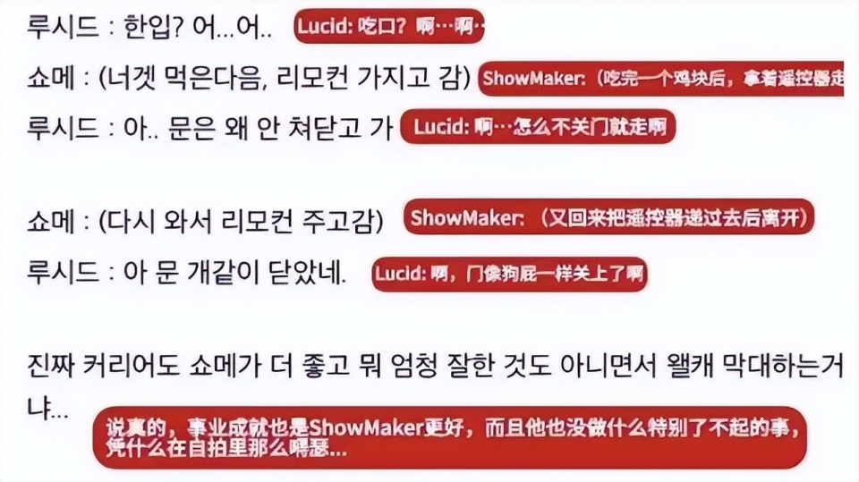 许哥离开之后,Lucid还吐槽了一句:说真的,事业成就也是许秀更好,而且他没做什么特别了不起的事,凭什么在自拍里那么嘚瑟,本身形容许哥的词,就带有侮辱性(混D、像狗一样),后面还说一些质疑许哥的话,所以纪录片一出就引发了节奏,现在很多玩家,都在为许哥打抱不平。