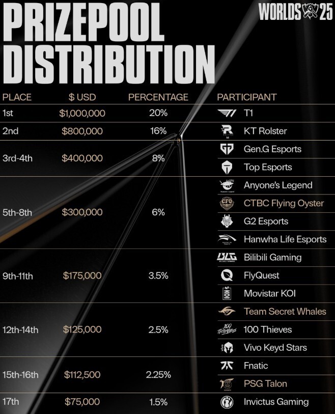 S15奖金分配:T1拿到一百万美元,BLG十七万五千,iG七万五千